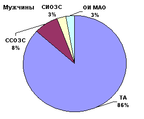 Среди чаще всего назначаемых антидепрессантов были трициклические (амитриптилин, азафен). Эта группа тимолептиков чаще назначалась женщинам. В то же время у мужчин чаще применялись селективные стимуляторы обратного захвата серотонина (тианептин). У них использовался обратимый ингибитор моноаминооксидазы – МАО типа А – пиразидол ( в соответствии с рисунком 2).