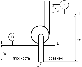 Напор насоса равен разности значений полного напора жидкости за насосом(сечение Н-Н) и перед ним (сечение b-b).