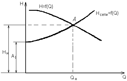 Выражение (2), представляющее собой уравнение параболы, является характеристикой трубопровода. Если характеристику трубопровода представить на одном графике с рабочей характеристикой насоса