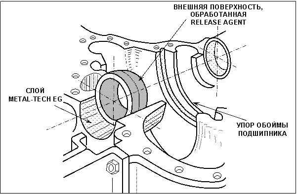 При ремонтах на месте нанесите продукт непосредственно на внешнюю окружность подшипника, но только на заднюю половину внешней обоймы. Помните, что пустота между подшипником и посадочным гнездом должна быть полностью заполнена. Там не должно быть промежутков. Также существенно то, что Thortex Metal-Tech EG не вытесняется, если он, даже случайно, был наложен на заднюю сторону посадочного места подшипника.