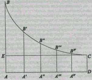 Пусть число единиц труда на следующем чертеже измеряется вдоль линии AD. Пусть они вступают в работу последовательным рядом единиц, в связи с неизменной величиной капитала. Продукт первой единицы как работающей при помощи всего капитала измеряется линией АВ. То, что вторая единица добавляет к этому продукту, выражается линией А'В'. Третья единица увеличивает выпуск на А "В", следующая на А '"В"' и последняя на DC. DC измеряет эффективную производительность всякой единицы труда в ряду и определяет общий уровень заработной платы. Если бы первая единица труда потребовала себе больше, чем величина DC, предприниматели устранили бы ее и заменили бы ее последней единицей. То, что они теряют вследствие устранения какой-либо единицы из всей рабочей силы, есть величина DC.