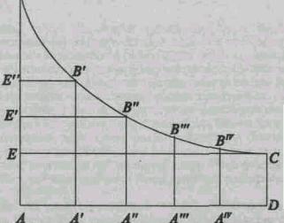 Возьмем теперь обратный случай. Пусть труд будет неизменным элементом и пусть общественный капитал возрастает, меняя, конечно, при увеличении свои формы. ABCD есть весь продукт, АВ - продукт первой единицы капитала, А 'В' - продукт второй, А "В" - продукт третьей и DC - продукт последней единицы капитала.