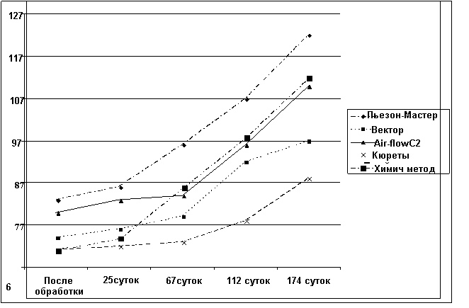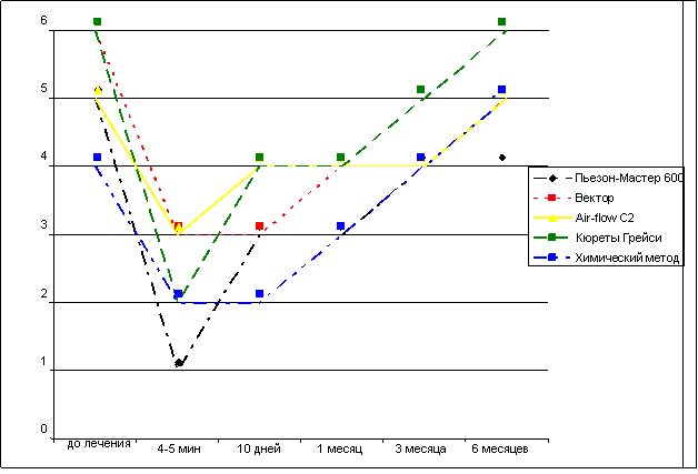 В группах с применением аппаратов Пьезон-Мастер 600, Эр-ФлоС2 и химического метода по нашим наблюдениям новый налет курильщика образовывался быстрее в сравнении с другими методами профессиональной чистки зубов.