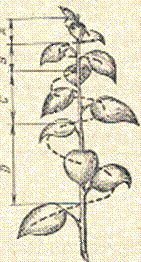 Листья на стебле расположены не по прямой, а окружают ветку по спирали. Сумма всех предыдущих шагов спирали, начиная с вершины, равна величине последующего шага А+В=С, В+С=Д и т. д. |