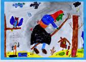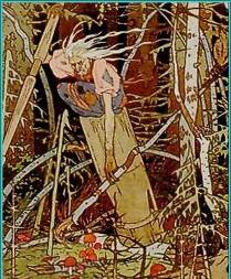 -Слышится в лесу страшный шум: деревья затрещали, сухие листья захрустели; выехала из лесу Баба – яга – в ступе едет, пестом погоняет, помелом след заметает. Подъехала к воротам, остановилась и, обнюхав вокруг себя, закричала: «Фу, фу! Русским духом пахнет! Кто здесь?» Ребята, посмотрите, как изобразил Бабу-ягу художник Иван Билибин (дети рассматривают картину, обсуждают)