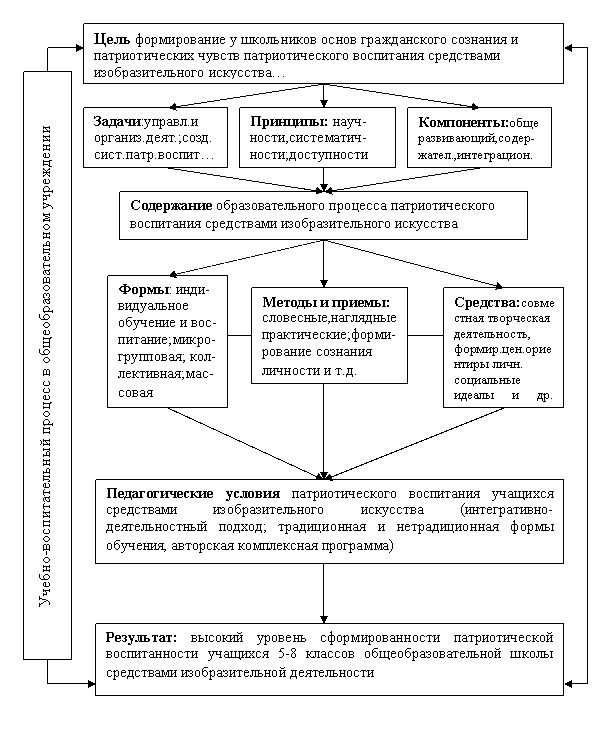 -учитываются и последовательно реализуются педагогические условия, обеспечивающие наиболее эффективное использование модели процесса патриотического воспитания учащихся средствами изобразительного искусства в целостном учебно-воспитательном процессе общеобразовательной школы;