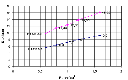 Для определения параметров регулятора, необходимых для обеспечения требуемого расхода воды через поилки были проведены опыты, результаты которых приведены ниже. Зависимость расхода воды через 2 боковых отверстия штока клапана от давления воды в сети представлена на рис.13.