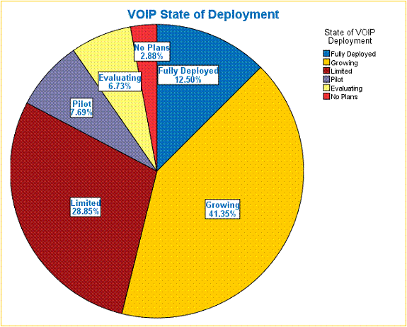 Ситуация с внедрением VOIP в течение прошедшего года практически не менялась. Лишь около 3% из числа исследованных организаций в настоящее время ничего не предпринимают в отношении VOIP. Более половины (53,85%) либо завершили (12,5%), либо осуществляют внедрение этой технологии в масштабах всей организации (41,35%). 28,85% реализуют проекты по частичному внедрению, то есть применяют VOIP для решения тактических задач, например для определенных категорий сотрудников, приложений или подразделений. Остальные (14,42%) пока только оценивают технологию и поставщиков решений VOIP или проводят испытания. (См. Рис. 1: Степень внедрения VOIP, стр. 3.)