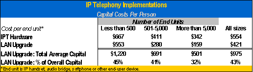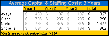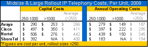 В целом, затраты снижаются по мере роста конкуренции между поставщиками и приобретения ИТ-специалистами опыта в обслуживании систем IP-телефонии. С точки зрения капитальных инвестиций, клиенты Avaya чаще выбирают централизованную архитектуру по сравнению с конкурирующими производителями. Так, компания может купить большую IP-АТС для вычислительного центра и подключить к ней тысячи телефонов в разных филиалах; по мере увеличения количества абонентов стоимость на терминал существенно снижается, так как при этом не нужно добавлять новые АТС. Сети на основе продукции Cisco или Nortel чаще имеют распределенную или региональную архитектуру, в которой для обслуживания того же количества терминалов требуется больше оборудования. ShoreTel также использует распределенную архитектуру, но цены на оборудование таковы, что стоимость сравнима со стоимостью централизованных решений.