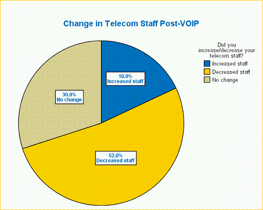 ± Изменения штатов (ИТ). Переход от TDM к VOIP не сопровождается значительным уменьшением потребности в обслуживающем персонале, однако компаний, сокращающих свой ИТ-штат при таком переходе, все же больше, чем расширяющих. Среди компаний, сокращающих штат, среднее количество освобождаемых сотрудников составляет 2,8; в большинстве случаев людей при этом не увольняют, а переводят на другую работу, или сокращают штатную единицу после ухода сотрудника на пенсию. Увеличение штата происходит в среднем на одного человека. (См. Рис. 3: Изменение штатов при внедрении VOIP, стр. 3.)
