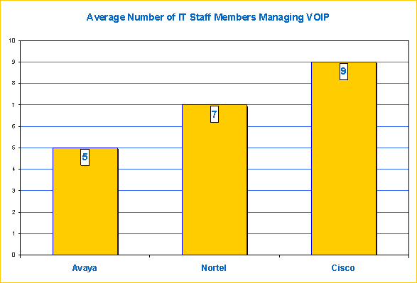По продукции Avaya, Cisco и Nortel мы имели достаточно данных для независимой оценки стоимости внедрения в больших и средних сетях. В среднем для мониторинга и администрирования системы Avaya требуется пять штатных единиц (в эквивалентах полной занятости), для системы Nortel – семь, Cisco – девять. (См. Рис. 7: Среднее количество менеджеров VOIP, стр. 3.) Эти общие цифры, однако, не дают полной картины, так как все зависит от размера сети, которую обслуживает та или иная бригада. Средние размеры сетей были одинаковыми для трех названных производителей, что делает эти цифры достаточно содержательными. Тем не менее, для более корректного сравнения мы соотнесли количество менеджеров VOIP с числом терминальных устройств.
