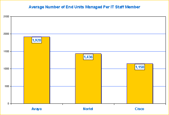 Как видим, полученные результаты соответствуют приведенным выше цифрам, подтверждая, что решения от Avaya являются самыми дешевыми в эксплуатации по затратам труда. В типичной сети Avaya один сотрудник обслуживает 1920 терминалов, в то время как в сети Nortel – 1436, а Cisco – всего 1150. (См. Рис. 8: Количество терминалов на ЭПЗ, стр. 3.)