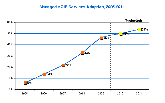 Почти половина (46%) всех компаний, внедривших VOIP, уже используют те или иные услуги сторонних организаций в том или ином качестве. (См. Рис. 9: Использование услуг управления VOIP, 2005–2011 гг., стр. 3.) В течение последних четырех лет доля таких компаний увеличивалась довольно быстрыми темпами; умеренный рост ожидается и в ближайшие два года (умеренный только по той причине, что многие компании замедлили внедрение новых технологий из-за экономического спада). Компании обращаются к поставщикам услуг управления по разным причинам. В одних случаях они пытаются компенсировать недостаток собственных квалифицированных кадров. В других – предпочитают сосредоточить усилия своих специалистов на более важных проектах, чем освоение VOIP. А в некоторых компаниях новые технологии работают так хорошо, что нет необходимости выделять на управление VOIP полную штатную единицу (а брать для этих целей работника на неполную рабочую неделю нежелательно).