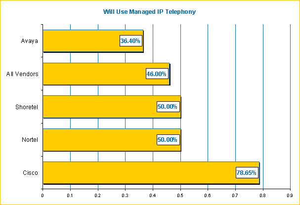 Среди клиентов Nortel и ShoreTel одинаковое количество пользуется услугами управления (50%). Управление системами ShoreTel поручают сторонним организацям, как правило, малые и средние компании, для которых эти системы оказываются слишком простыми в обслуживании. Поэтому, вместо того, чтобы нанимать для этой цели сотрудника на неполную ставку, они заключают договор на круглосуточный сервис со специализированной фирмой. Клиенты Nortel обычно обращаются к поставщикам услуг, чтобы усилить собственный штат. Часто в системах Nortel одновременно используются технологии TDM и IP, и клиенты заключают договор на обслуживание IP-компонентов, а собственные сотрудники тем временем обслуживают TDM-часть и изучают IP-системы.