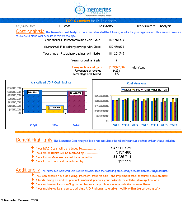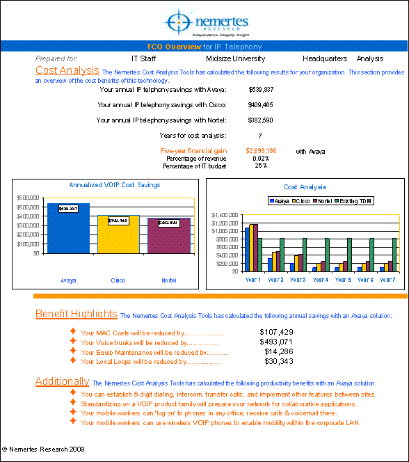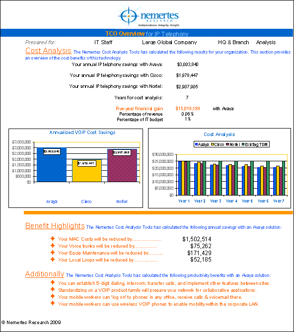 В большинстве рассмотренных нами сценариев наблюдается та или иная экономия, независимо от поставщика решений. Для средних и больших сетей Avaya оставляет позади Cisco и Nortel по таким показателям, как экономия и срок окупаемости. Экономический эффект от внедрения IP-телефонии на базе продукции Cisco уменьшается по мере увеличения размера сети. В примере средней сети (800 телефонов) среднегодовая экономия при внедрении продукции Avaya превышает аналогичный показатель для продукции Cisco на 31%, а для продукции Nortel – на 41%.