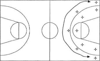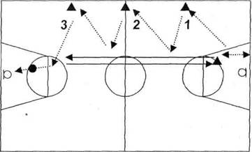 Игрок выполняет по 2 броска с 5 точек. С каждой точки: первый - в трехочковой зоне, второй - в двухочковой. На выполнение задания дается 2 мин.