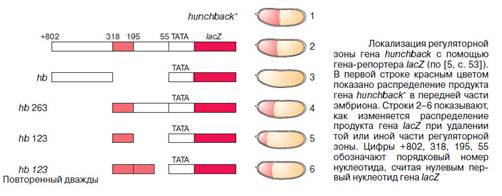2. Изучение работы регуляторных участков ДНК отдельно от их генов. Составной трансген, составленный из изучаемого регуляторного участка и репортерного гена, например гена LacZ бета-галактозидазы. (Гидролиз одного из синтетических субстратов, галактозида X-gal, нерастворим и имет синюю окраску, так что обработанные иsм клетки синеют, если бета-галактозидаза работала.) Впервые в Геринг в 1985 г. с регуляторным участком к гену гомеозисному гену ftz. Сокращая регуляторные участки, можно узнать конкретные последовательности, ответственные за включение или выключение в определенных клетках.