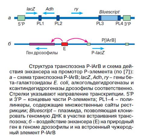 5. Энхансерная ловушка. Поиск наборов совместно экспрессирующихся генов. В гг. в лаборатории того же Геринга. Взяли Р элемент, имеющий ген lacZ под слабым промотором, в норме почти не работающим. Кроме того, там были репортерный ген ксантингидрогеназы ry+ позволяющий констатировать успешность встраивания транспозона и возможность экспрессии генов под сильным промотором (таковым в случае репортерного ry+ является его собственный промотор), а также элементы, нацеленные на последующее молекулярно-генетическое изучение окрестностей встройки: полилинкеры – участки распознания разными рестриктазами, да еще в придачу и популярная в генной инженерии плазмида Bluescript. (Кроме того, там же присутствовал репортерный ген алкогольдегидрогеназы Adh, позволяющий следить за этой конструкцией в тех бактериях, где он нарабатывается.)