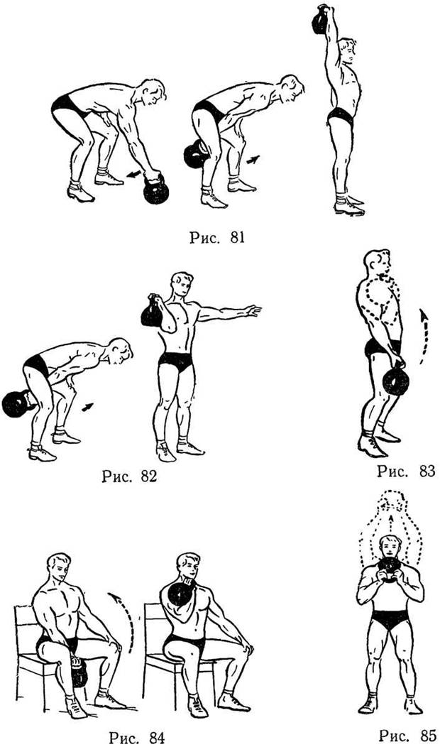 И. п.: ноги на ширине плеч, туловище наклонено вперед, прямая рука держит за дужку гири, колени согнуты (см. рис. 81).