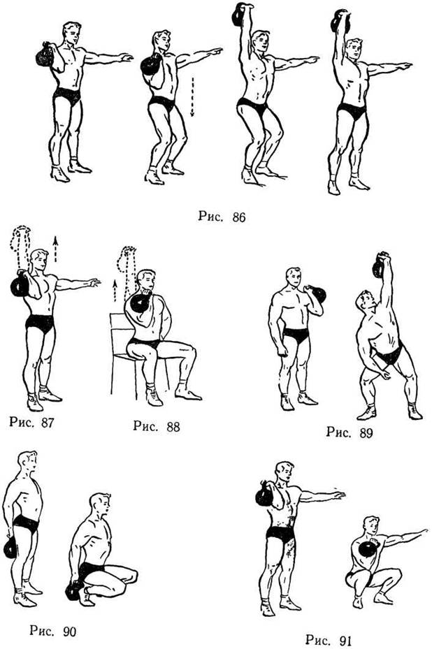 Упражнение 5 (рис. 86) для рук плечевого пояса и ног. Толчок гири одной рукой.