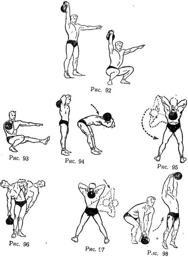 Вариант (рис. 92). То же, но приседать и вставать, удерживая гирю на прямой руке вверху.