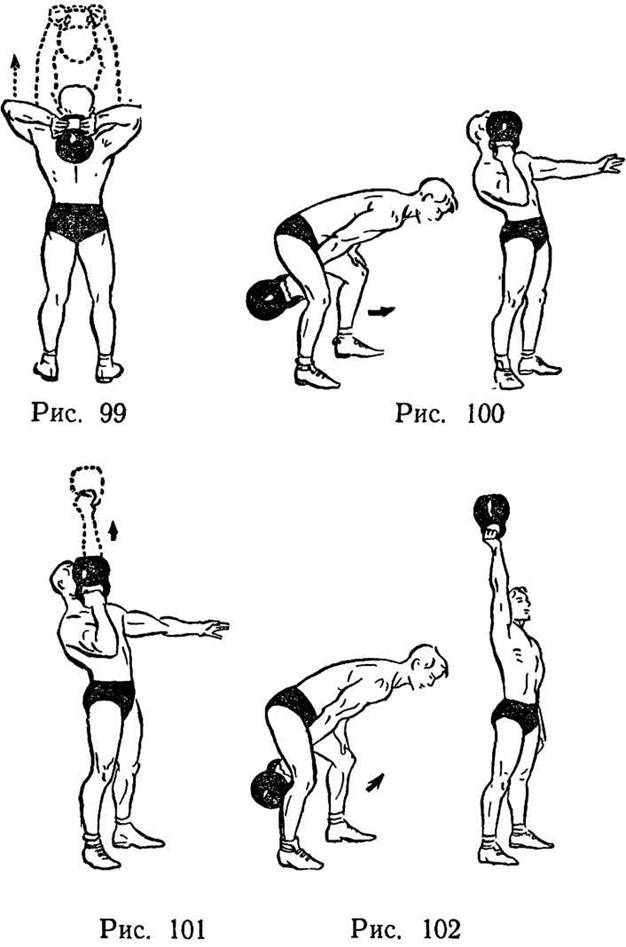 Упражнение 16 (рис. 99) для мышц трехглавых разгибателей плеч (трицепсов). Выжимание гири из-за головы силой разгибателей рук (трицепсов).