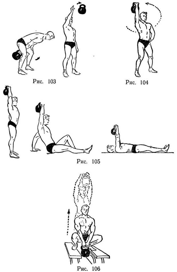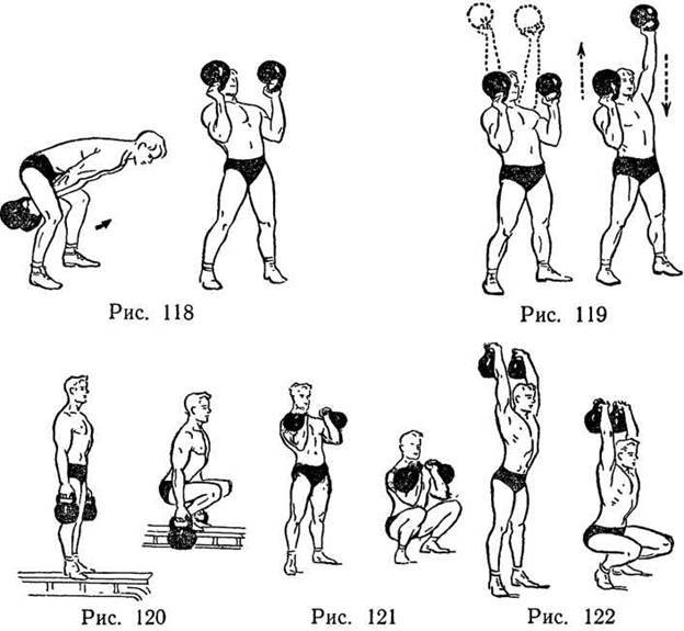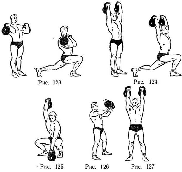 Вариант (рис. 124). То же упражнение, но гири держать вверху на прямых руках.