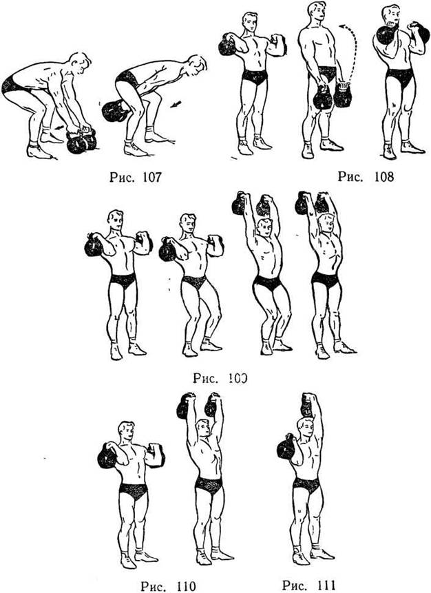 Упражнение 24 (рис. 107) для мышц спины, ног и рук. Подъем двух гирь к плечам махом.