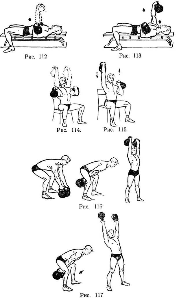 Вариант (рис. 115). Выжимание гирь вверх попеременно.