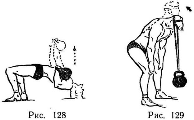 Упражнение 38 (рис. 125) для мышц-сгибателей и разгибателей плеч, плечевого пояса и туловища. Доношение гирь.