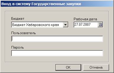 4. В появившемся меню в пункте «Бюджет» выбрать «Бюджет Хабаровского края» (либо соответствующий бюджет для муниципальных образований), в пункте «Пользователь» - логин, в пункте «пароль» - свой пароль (логин и пароль должны быть получены на адрес электронной почты, указанный при регистрации в системе):