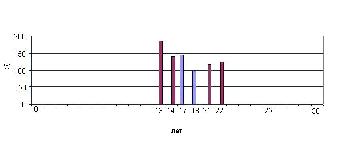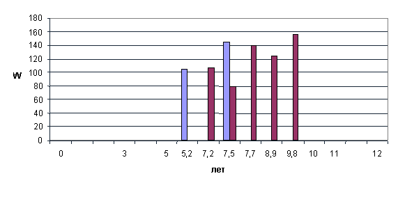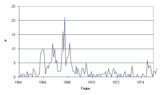 Рис.5. Число n ярких болидов (М∞ > 5 кг) Прерийной болидной сети за четный цикл СА (1965 – 1975 гг.) [11].