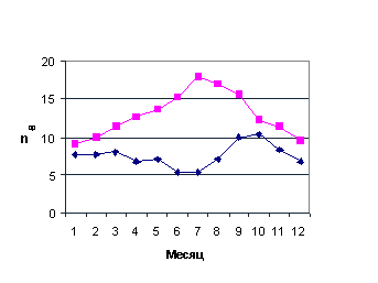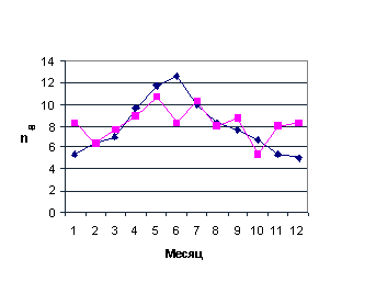 Рис.7. Годичная вариация численности болидов в четные циклы СА.