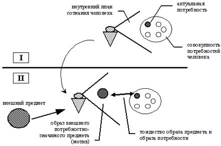Мотивация (как процесс) – есть процесс эмоционально-чувственного сопоставления образа своей потребности с образом внешнего предмета (претендента на предмет потребности). Или, мотивация (как механизм) – это внутренний психический механизм человека, который обеспечивает опознание предмета соответствующего потребности и запускает направленное поведение по присвоению этого предмета (если он соответствует потребности). На схеме 1 видно, что мотивация может протекать у человека без посторонней помощи[3].