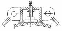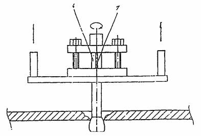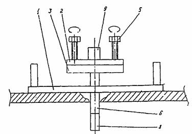 5.1.1. Выборочный ремонт сквозных отверстий диаметром до 14 мм, расположенных на верхней половине сечения трубы, может быть произведен при помощи устройства для заделки свищей УЗС-01, состоящего из опорной плиты, упорной и нажимной планок, установленных на опорной плите при помощи направляющих (рис. 3). В упорной и нажимной планках установлена шпилька с упорной втулкой и уплотнителем.