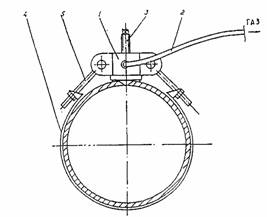 5.1.6. При производстве работ хомут устанавливается на трубу в непосредственной близости от дефекта. На нем монтируется при помощи стяжных болтов полностью собранный (с винтовым затвором и отводным шлангом) стакан, который перемещением хомута по трубе надвигается на дефект. Правильность установки стакана определяется по началу интенсивного выхода газа из отводного шланга. После фиксации стакана и хомута натяжными шпильками, а также завинчивания до упора затвора (5) выход газа должен полностью прекратиться. Затем производится восстановление изоляции трубопровода.