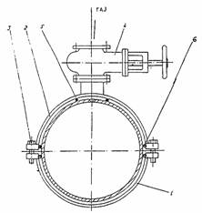 5.1.5. Для выборочного ремонта труб газопроводов при ликвидации свищевых повреждений и единичных сквозных коррозионных каверн диаметром до 25 мм независимо от места их расположения на поверхности трубопровода может быть использован ремонтный хомут ВГ-101, состоящий из стакана с отводным шлангом и винтовым затвором и собственно крепежного хомута, соединенного со стаканом натяжными болтами (рис. 4).
