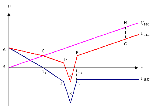 По оси ординат располагается предельная полезность социального капитала фирмы (U), по оси абсцисс время (T). Предельная полезность совокупного социального капитала (UTSC) определяется как сумма предельной полезности позитивного социального капитала (UPSC) и предельной полезности негативного социального капитала (UNSC). Текущая полезность негативного социального капитала в момент времени Ti будет определяться разницей между UTSC и UPSC. В долгосрочном периоде данная разница становится отрицательной и принимает значение HG. Сумма накопленной величины полезности от использования негативного социального капитала определяется как разница между ABC и CDEFGH.