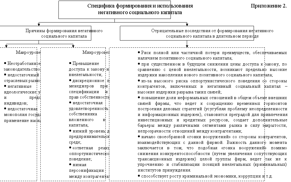 Как видно из представленного анализа, смещение акцентов в трактовках природы социального капитала фирмы с его абсолютного общественного начала на сочетание общественного и частного элементов может быть достаточно плодотворным, развивающим данные концепции. Данный подход также позволяет учесть в анализе и такие «нетрадиционные» элементы экономической действительности, как внелегальная деятельность и недобросовестная конкуренция и их взаимовлияние с негативной формой социального капитала фирмы. При этом данная форма социального капитала фирмы не просто снижает эффективность отдельных фирм в длительном периоде, но и во многом способствует усилению отрицательных тенденций в экономике в целом (Приложение 2).