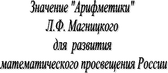 Практическая значимость работы заключается в систематизации сведений по теме исследования, популяризации знаний о Магницком и его Арифметике как «одним из важнейших явлений книгопечатной деятельности Петровского времени»1, в разработке наглядного материала для использования на уроках и внеклассной работе по математике, в работе школьного научного общества. Таким образом, рассмотрение вопросов связанных с данной тематикой носит как теоретическую, так и практическую значимость.