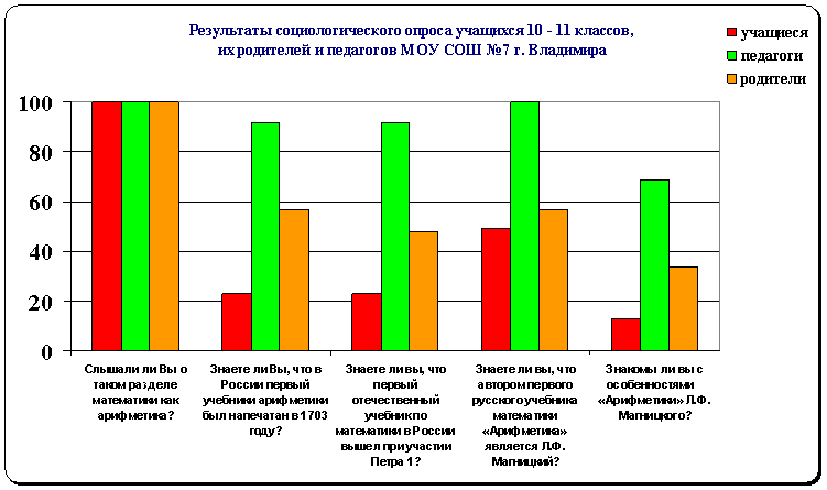 Каждый образованный человек знает такой раздел математики как арифметика, но не каждый может сказать, какой вклад внес Магницкий в развитие математического просвещения России. Для изучения уровня осведомленности об истории развития математического просвещения в России в начале XVIII века нами был проведен социологический опрос, в рамках которого учащимся 10 – 11 классов, их родителям и педагогам школы было предложено ответить на следующие вопросы: