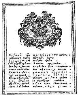 Следующие 11 страниц заняты «стихами на предложенный герб»: «На честнии крест на государев герб до лица его царского пресветлаго величества царя и самодержавца Петра Алексиевича всея России». Стихи эти – посвящение, в котором автор излагает цель издания, содержание книги и называет источники его труда. Затем автор описывает содержание каждой части своей книги, завершая стихотворное предисловие словами: «И желаем да будет сей труд, добре пользовать русский весь люд».