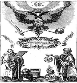 Следующую страницу книги занимает фронтиспис (Приложение 4). Фронтиспис – довольно сложная композиция, изображающая русский герб, внизу – изображение Пифагора и Архимеда. Пифагор с непокрытой головой в одежде, подбитой мехом. В руках у него доска, весы, ниже – циркуль, линейка, перо, чернильница. Справа изображен Архимед, в тюрбане, в одежде с меховым воротником. В руках у него сфера, таблица математических формул; ниже – глобус, макет корабля. Возле Пифагора – ларец и мешок с деньгами, две формы и два тюка с товарами, завязанный мешок – короче, атрибуты торговли и предметы, необходимые при обучении математике. Над ними в картуше четверостишие: «Арифметика Политика сих и другая Логистика. И многих иных издателей в разна времена писателей». Надо полагать, что приложенное к «Арифметике» слово «политика» здесь дано в смысле управления законами математики. К сожалению, неизвестно, кем и как составлена эта картина, представляет ли она продукт творчества самого Магницкого или же заимствована им из какого-либо иностранного сочинения.