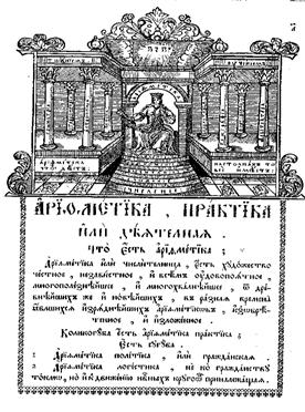 Обращает на себя внимание заставка (Приложение 7), помещенная перед началом текста. На ней дано аллегорическое изображение Арифметики в виде женщины в короне, сидящей на троне, под сенью, укрепленной на восьми “столпах”. В правой руке она держит ключ, левой – опирается на треугольник с цифрами. Трон стоит на возвышении, к нему ведут пять ступеней, на которых следующие слова (снизу): счисление, сложение, вычитание, умножение, деление. Вокруг трона на колоннах («столпах») с левой стороны от читателя: геометрия, стереометрия, астрономия, оптика; с правой – меркатория, география, фортификация, архитектура. В основании «столпов» слева: «арифметика что деет»; справа: «на столпах то все имеет». Вверху на фронтоне в лучах – «ягве» – имя божие на иврите, ниже – изречение: «тщанием и учением». Завершается гравюра лиственным орнаментом.