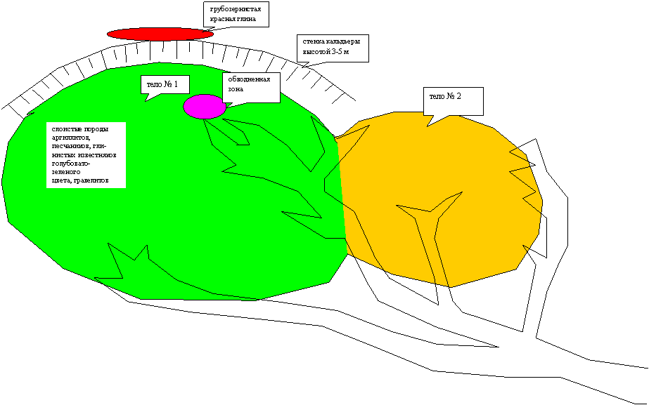 -с юга в контуре объекта на поверхность выходят глинистые породы голубовато-зеленых цветов с охристыми пятнами; с запада, юга и востока по контуру залегают яркие красные глины; |