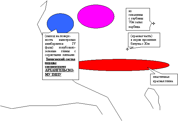 признаки выветрелых кимберлитов: -глинистые породы зеленых и голубоватых оттенков с охристыми пятнами; |
