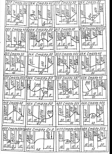 Графическая часть задания по фасонным резцам выполняется на листе формата А1. В левой части формата выполняется расчетная схема с чертежом детали и резца в необходимом масштабе. На детали указываются необходимые размеры с допусками, на резце - размеры по передней поверхности и другие размеры, получаемые в ходе аналитического расчета. В центре листа дается рабочий чертеж фасонного резца с указанием необходимых размеров, допусков, величин шероховатости, здесь же вынесенный отдельно чертеж профиля резца в необходимом масштабе, достаточном для детального нанесения всех размеров профиля с необходимыми допусками. На профиле резца указываются не диаметры, а только высоты профиля от базовой поверхности. В правой части дается в необходимом масштабе рабочий чертеж шаблона и контршаблона, величины шероховатости их поверхностей. При наличии места на формате дается график изменения углов. В углу над штампом указываются технические условия на изготовление резца, материал, вид термообработки и твердость шаблона и контршаблона, в конце дается обозначение маркировки фасонного резца.