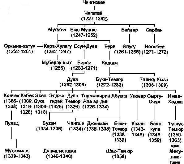 Можно привести династическую таблицу потомков Чагатая, последовательных ханов улуса Чагатая.