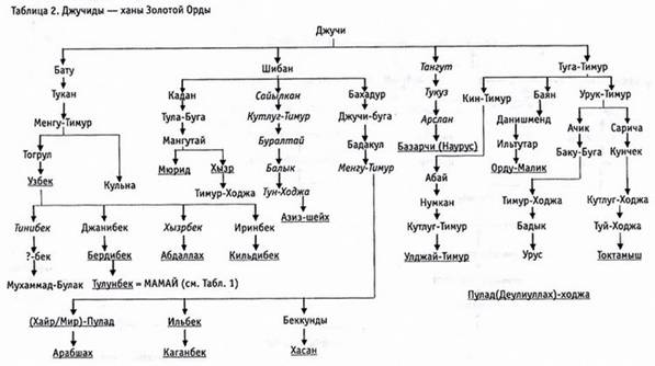 По яссе потомки Джучи имели самые большие права на звание главного хана империи, не говоря уже об улусе Джучи. Но до них очередь дошла уже после гибели Бердибека. И Урус пытался организовать свою династию. Существуют варианты этой таблицы. Каждый претендент на роль хана имел свой взгляд на свое генеалогическое древо. Потомки Бату, Шибана и Тока(Туга) –Тимура пытались вычеркнуть из претендентов потомков Орда –Иуджина.