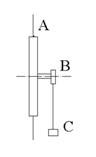 1. Вращая маятник за спицы A, намотать нить на шкив B и поднять груз C массой m, указанной на нем, на максимально возможную высоту h и измерить ее линейкой